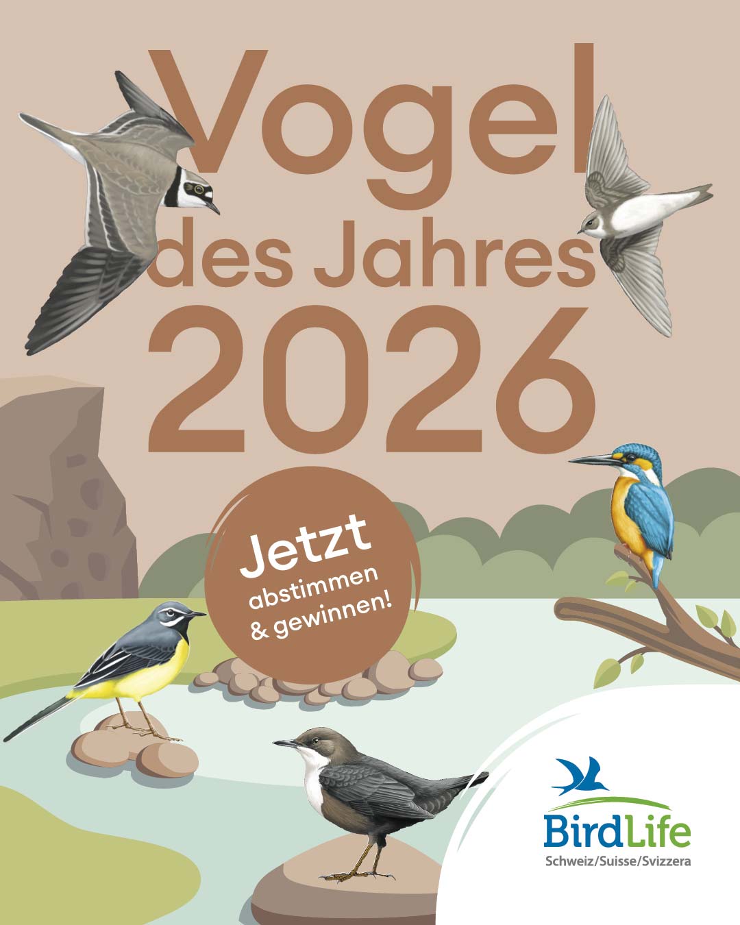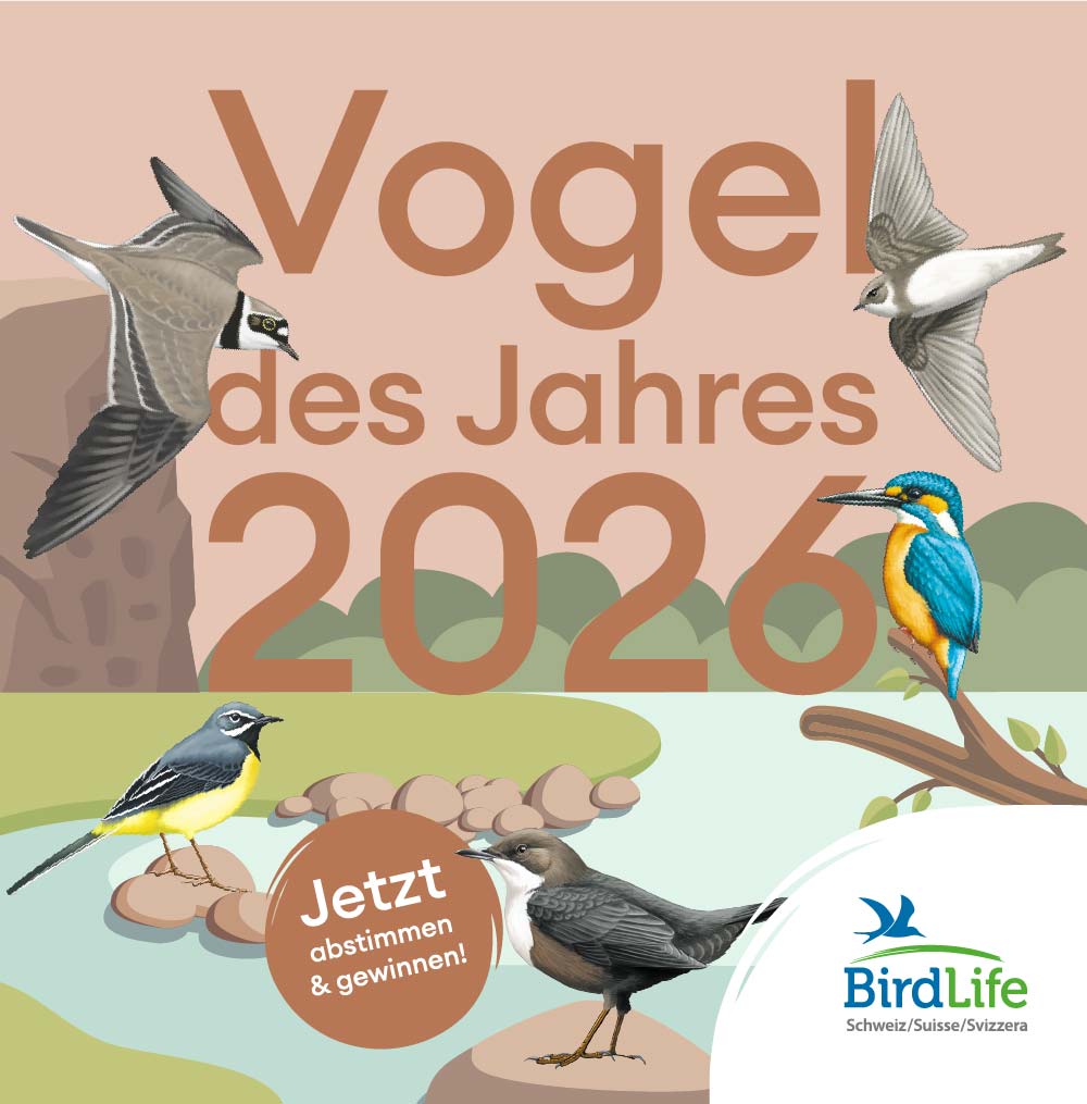 Die im vergangenen Jahr erstmals durchgeführte öffentliche Wahl zum Vogel des Jahres war ein grosser Erfolg und hat viele Menschen begeistert. In diesem Jahr möchte BirdLife mit dieser sympathischen Aktion auf ein wichtiges Thema aufmerksam machen: den Lebensraum Fliessgewässer. Zur Wahl stehen deshalb fünf Vogelarten, die alle besonders gut geeignet sind, 2026 als Botschafter für naturnahe Bäche und Flüsse zu wirken.