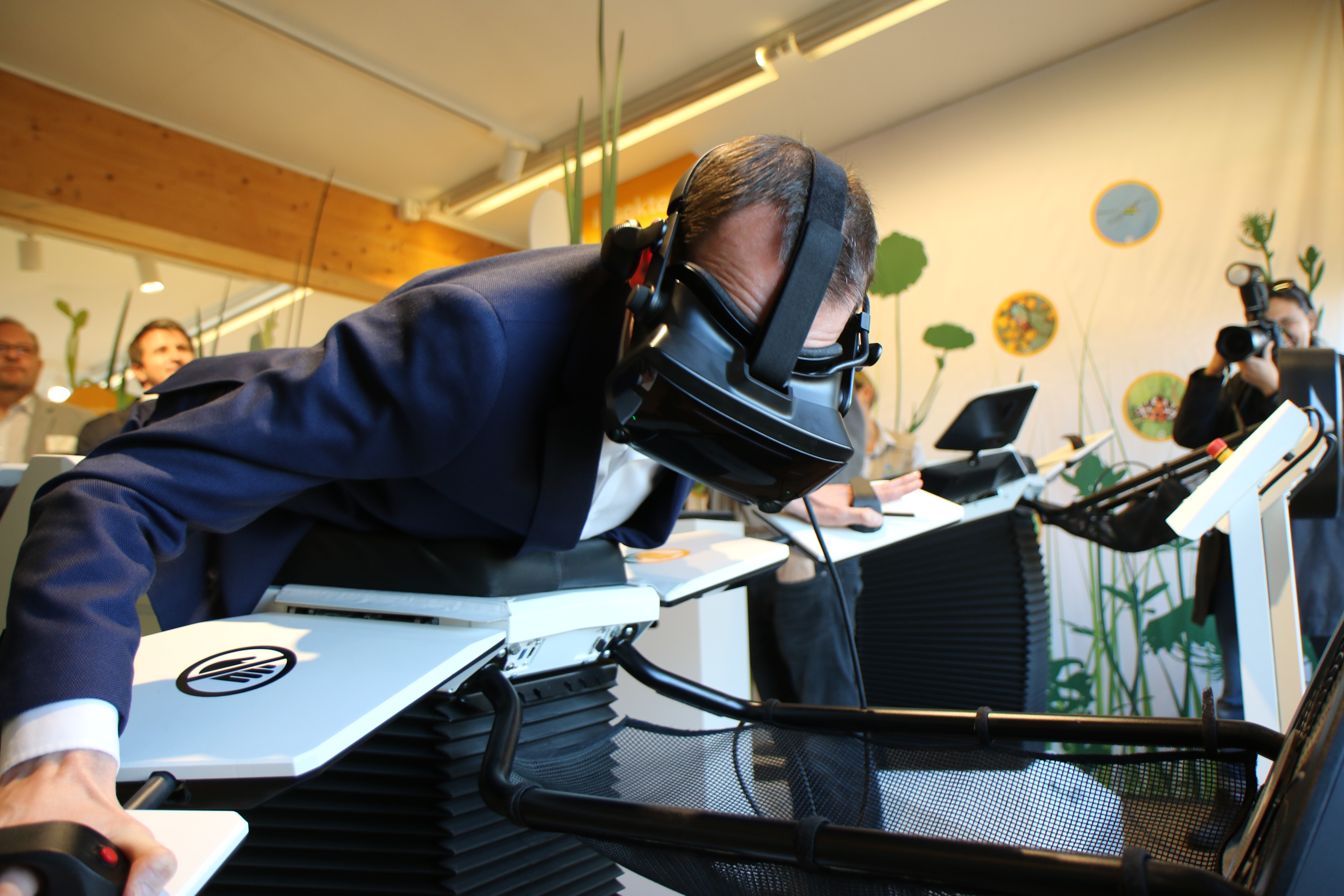 Regierungsrat Martin Neukom (ZH, Grüne) testet den Insektenflugsimulator. Foto: BirdLife Schweiz
