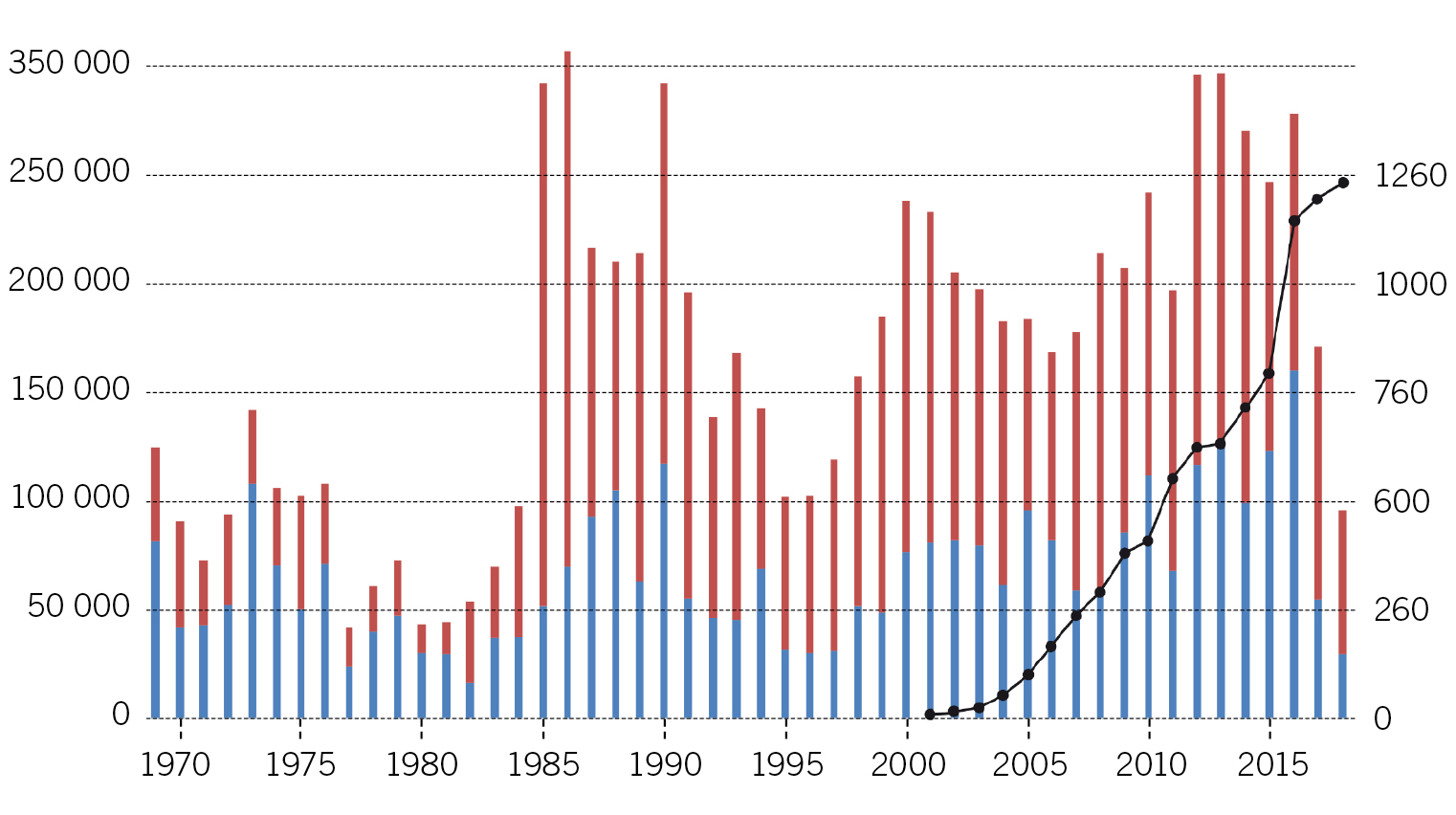- Dans les lacs suisses, les statistiques de pêche montrent des fluctuations cycliques du nombre des poissons qui intéressent la pêche commerciale, indépendamment du nombre de cormorans nicheurs. Le graphique ci-joint montre la situation des corégones (palées et bondelles) pour le lac de Neuchâtel. On voit ainsi que les années 2012 à 2016 ont été parmi les meilleures pour la pêche professionnelle alors que les effectifs de cormorans étaient déjà supérieurs à 700 couples. A l’inverse, les années où les prises ont été les plus faibles (1978 à 1984), les cormorans n’étaient pas encore installés comme espèce nicheuse.