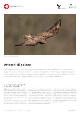 Occasionalmente capita che persone che fanno jogging vengano attaccate da rapaci; nella stragrande maggioranza dei casi si tratta di poiane. Gli attacchi inaspettati si verificano quasi sempre da maggio a luglio, quando gli uccelli hanno i piccoli e vogliono difenderli da un presunto nemico. Di norma, si tratta di finti attacchi innocui. I jogger dovrebbero evitare l’area o attraversarla camminando.