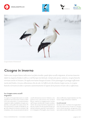 Vedere una cicogna bianca nella neve è un fatto insolito: quale tipico uccello migratore, di norma trascorre infatti la stagione fredda in Africa o nell’Europa meridionale. Sempre più spesso, tuttavia, cicogne bianche svernano anche in Svizzera. Di regola non hanno bisogno di aiuto. Il loro piumaggio le protegge sufficientemente dal freddo e trovano abbastanza cibo da sole. Se l’offerta di cibo diventa troppo scarsa, le cicogne bianche svernanti di solito si spostano autonomamente in regioni dove possono trovare cibo a sufficienza.