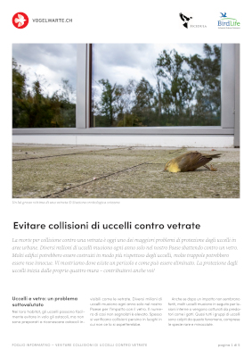 La morte per collisione contro una vetrata è oggi uno dei maggiori problemi di protezione degli uccelli in aree urbane. Diversi milioni di uccelli muoiono ogni anno solo nel nostro Paese sbattendo contro un vetro. Molti edifici potrebbero essere costruiti in modo più rispettoso degli uccelli, molte trappole potrebbero essere rese innocue. Vi mostriamo dove esiste un pericolo e come può essere eliminato. La protezione degli uccelli inizia dalle proprie quattro mura – contribuitevi anche voi!