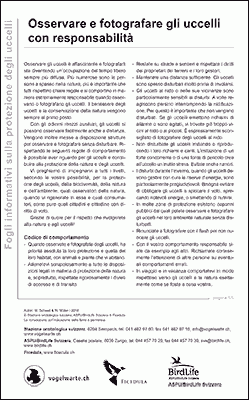 Osservare gli uccelli è affascinante e fotografarli sta diventando un’occupazione del tempo libero sempre più diffusa. Più numerose sono le persone a spasso nella natura, più è importante che tutti rispettino chiare regole e si comportino in maniera estremamente responsabile quando osservano o fotografano gli uccelli. Il benessere degli uccelli e la conservazione della natura vengono sempre al primo posto. Questo opuscolo descrive il codice di condotta di BirdLife Svizzera, Ficedula e della Stazione ornitologica svizzera.